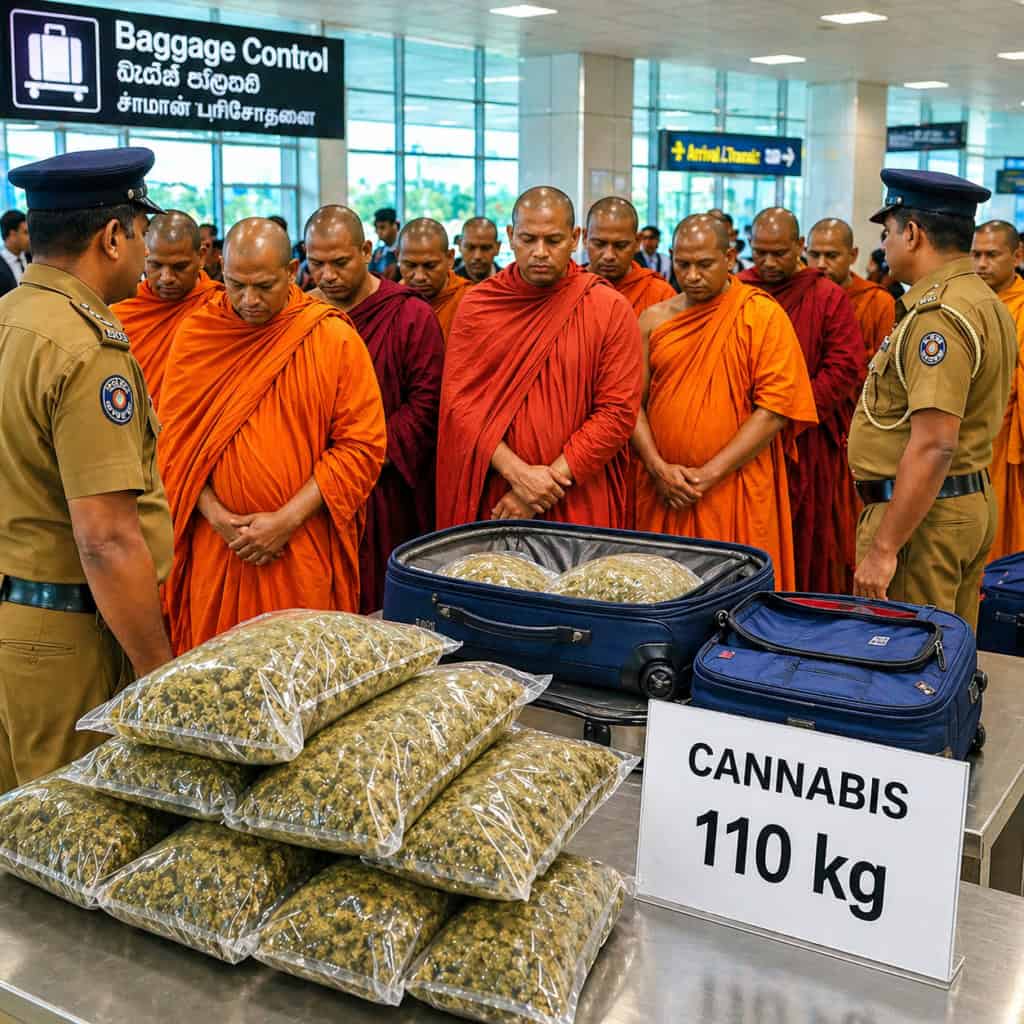 Tjugotvå buddhistiska munkar har gripits i Sri Lanka efter att myndigheter upptäckt en stor mängd cannabis i deras bagage på en flygplats, uppger polis.