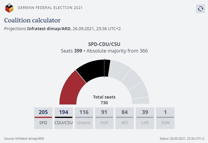 De tyska valet ser ut att gå mot ett rysande slut. Första prognosen som kom såg nästan uppgjord ut med 25% för både den kristdemokratiska alliansen och SPD, socialdemokraterna i landet. Nu har dock siffrorna nyanserats något och det står nu klart att SPD är de stora vinnarna när den avgående Angela Merkels kristdemokrater gör sitt sämsta val sedan 1949.