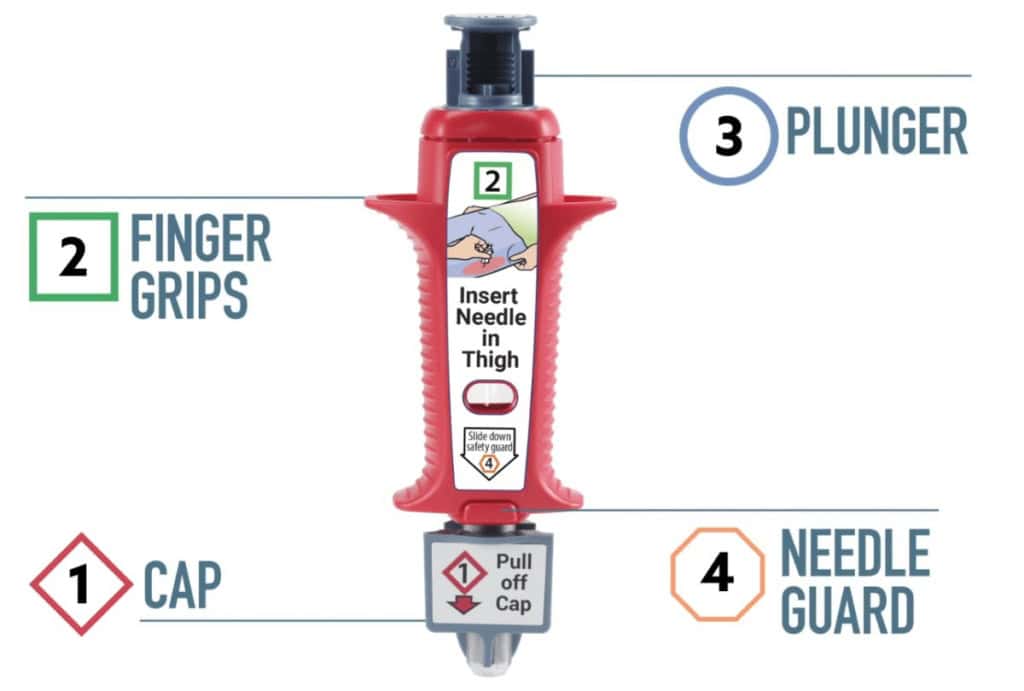Adamis Pharmaceuticals Corporation har utvecklat Zimhi. Den kan användas på språng – snabbt dra av locket och föra in nålen i låret.