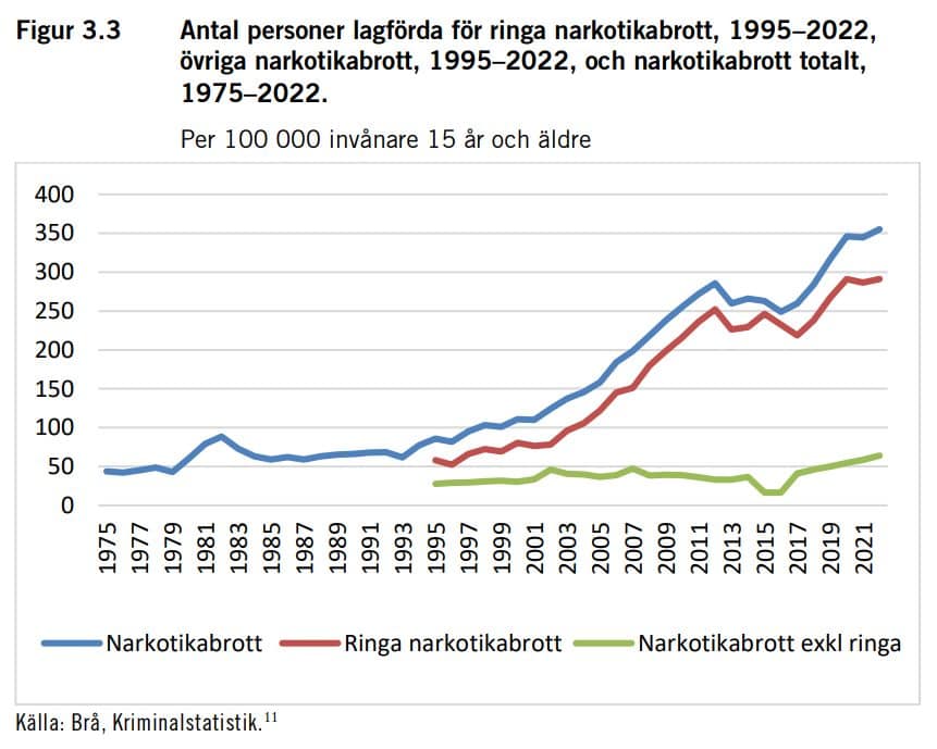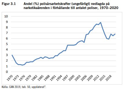Som framgår av diagrammet är det en stadigt ökande trend för hur stor del av polisresurserna som går åt till narkotikabrott. År 2020 hade det kommit upp till ungefär 7 procent. Den svenska polismyndigheten hade samma år cirka 34.000 medarbetare varav cirka 21.000 poliser. Sju procent av 21.000 poliser blir ungefär 1.500 poliser, men låt oss avrunda neråt för att vara på säkra sidan:
