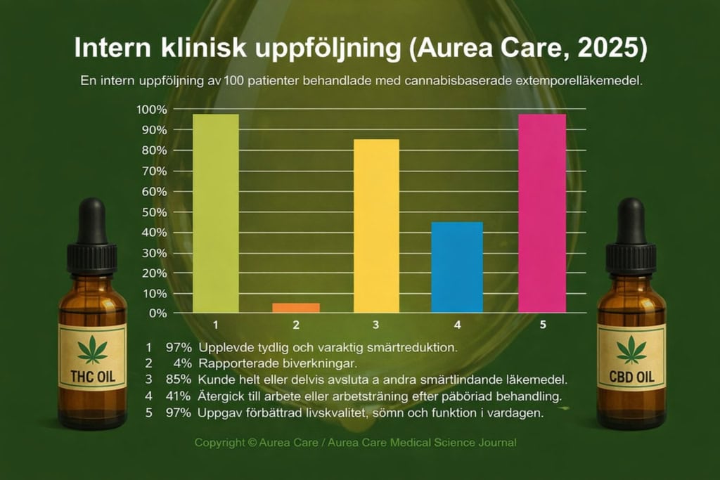 En intern uppföljning från en svensk smärtklinik som behandlar patienter med cannabisbaserade extemporeläkemedel visar uppmärksammade resultat. I en uppföljning av 100 patienter med svår kronisk smärta uppgav: