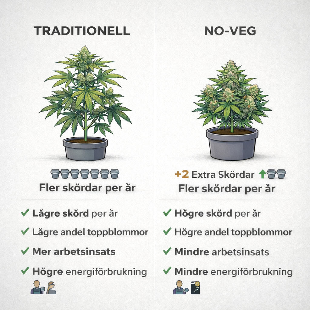 En så kallad ”no-veg”-metod låter plantorna gå direkt över till 12/12-ljuscykel, vilket innebär att man hoppar över den vegetativa fasen. Resultatet blir mindre skörd per enskild planta, men högre total årsproduktion – och en tydlig ökning av toppkvalitativa buds.
