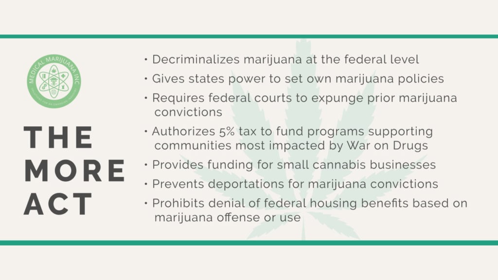 MORE Act skulle ta bort cannabis från Controlled Substances Act, vilket skulle göra det möjligt för delstaterna att legalisera cannabismarknader utan rädsla för federal inblandning. Den skulle innehålla bestämmelser om att personer med icke-våldsamma federala cannabisdomar som dömts för cannabis ska kunna få sina straff upphävda eller omprövas.