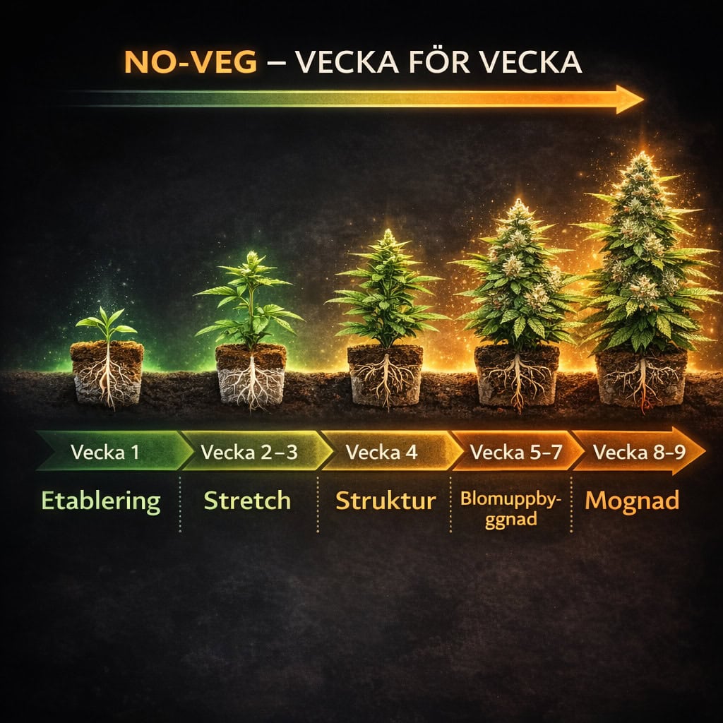 En så kallad ”no-veg”-metod låter plantorna gå direkt över till 12/12-ljuscykel, vilket innebär att man hoppar över den vegetativa fasen. Resultatet blir mindre skörd per enskild planta, men högre total årsproduktion – och en tydlig ökning av toppkvalitativa buds. Jag har tillbringat större delen av fyrtio år med att vandra genom cannabisträdgårdar. Från dolda guerillaodlingar …